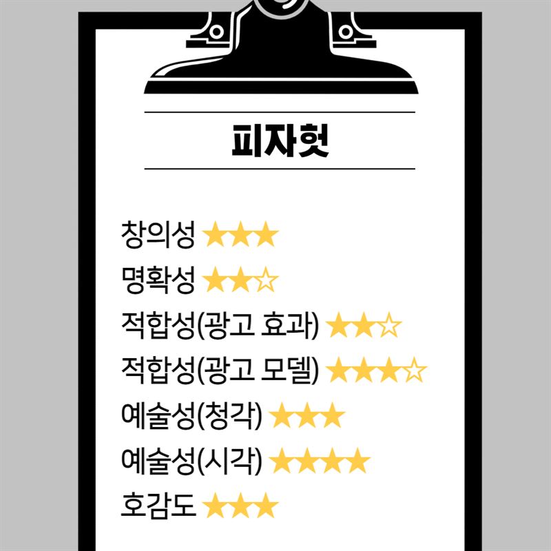 하지만 광고 효과의 명확성과 적합성에는 2.5점의 낮은 점수를 주며, 너무 많은 것을 담으려고 하다보니 피자헛 제품이 드러나지 못해 광고 효과가 높지 않다고 평가했습니다.