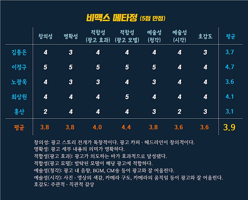 AP광고평론가들은 이 광고가 가수 비를 활용해 제품을 효과적으로 각인시킨다며 광고 모델의 적합성에 4.4점, 광고 효과의 적합성에 4점의 높은 점수를 줬습니다.