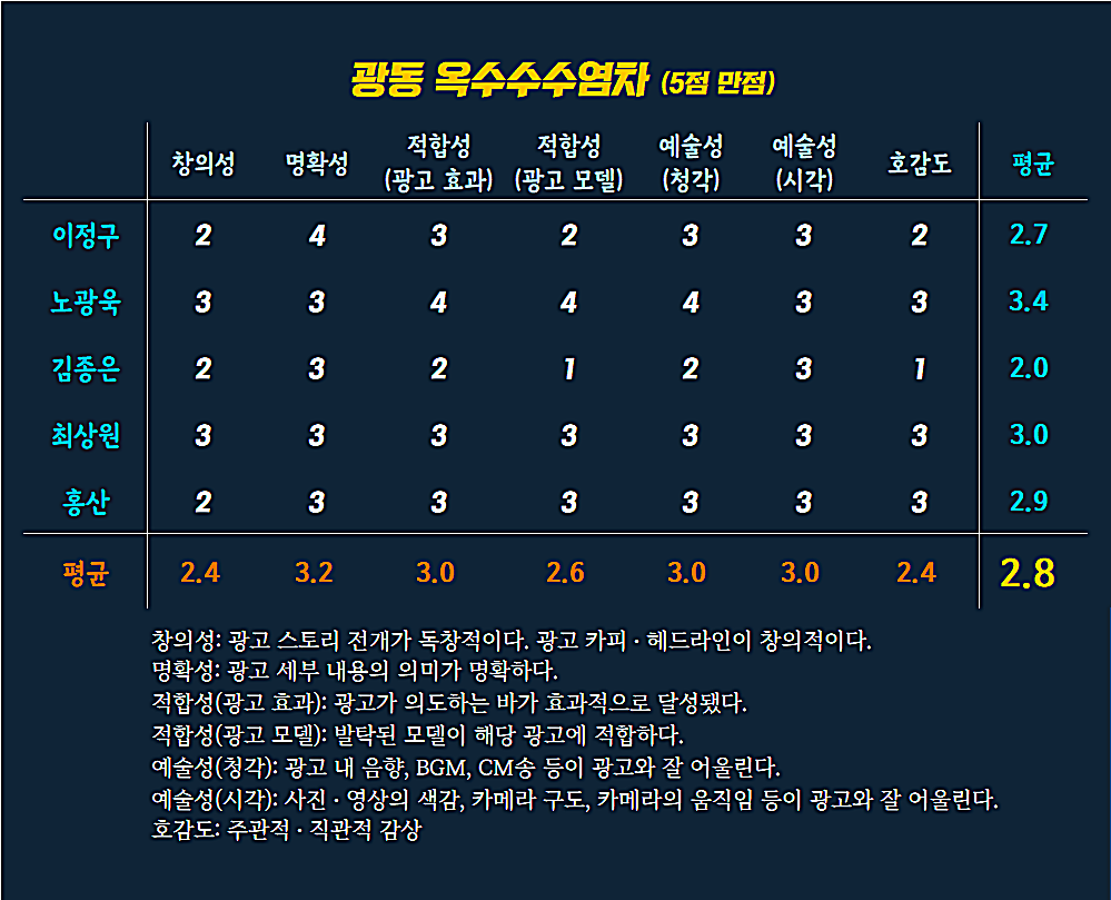 가상 인간 한유아가 식음료 광고 데뷔를 했다는 포인트를 내세워 스마일게이트와 광동의 윈윈을 노린 광고다. 스마일게이트가 만들어낸 가상 인간의 세계관이 현실 제품에 자연스럽게 확장된 사례라고 생각한다. 또한 옥수수를 '옥쓔'라고 줄여 중독성 있는 CM송을 잘 만들었다.