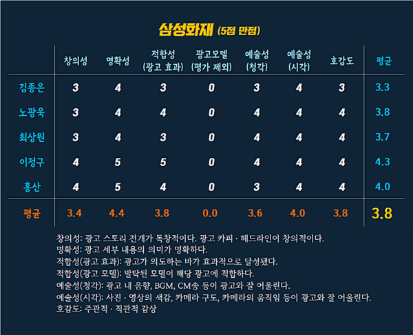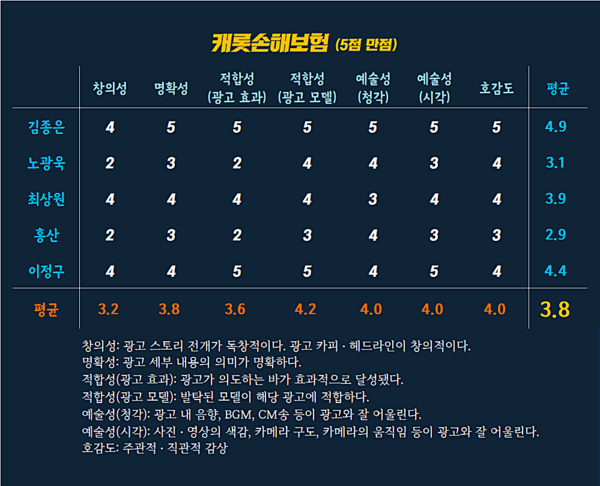 광고 효과의 적합성은 3.8, 예술성 청각 부문은 3.6점의 준수한 점수를 기록했다.호감도는 3.8, 총 평균 또한 3.8점을 기록했다