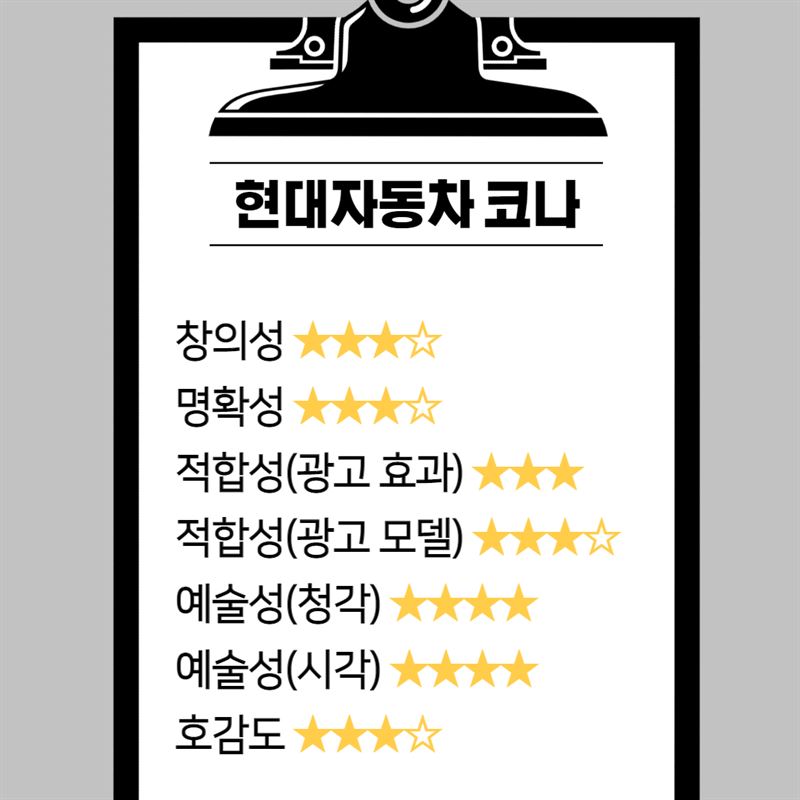 그리고 자동차 광고에 등장하는 동물들은 보통 자동차를 비유할 수 있는 빠른 맹수들, 예를 들면 사자, 표범, 치타 등이 등장하기 때문에 소비자는 등장하는 동물과 자동차를 연결해서 생각할 수 밖에 없다. 그런 점에서 거북이가 오브제로 등장하는 것이 코나라는 제품의 이미지에 그다지 좋은 영향을 주지 않는 것 같다. - 홍산 평론가