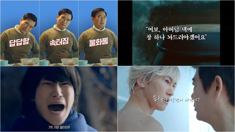 옥시레킷벤키저의 개비스콘, '아버님 댁에 보일러 놔드려야겠어요'라는 카피로 유명한 경동나비엔, '가! 가란 말이야!'로 잘 알려진 롯데칠성음료의 2% 부족할 때, 꽃을 든 남자 등 과거 소비자들에게 인기를 얻은 광고를 패러디합니다.