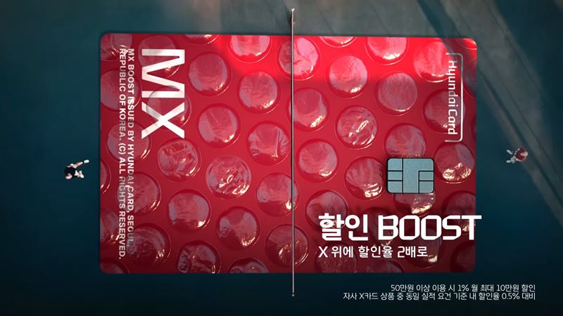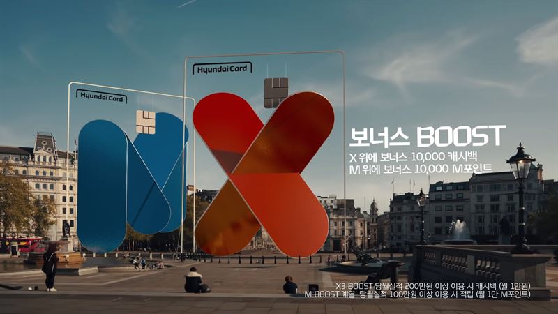 기존 M, X 카드의 혜택을 더욱 강화한 MX BOOST 카드 광고입니다.