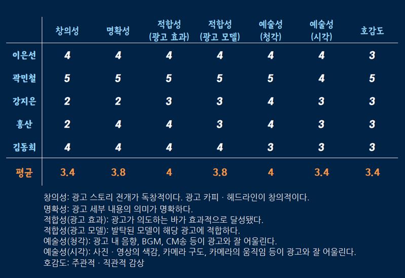 AP 광고평론가들은 명확성(광고 효과), 적합성(광고 효과), 예술성(청각) 측면에 4점을 부여하여 비교적 높은 평가를 한 반면, 창의성과 예술성(시각), 호감도는 3.5점으로 상대적으로 낮은 평점을 부여했습니다.