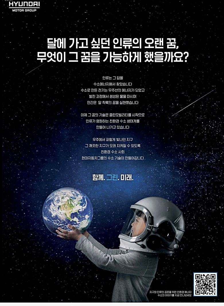 메인 카피가 조금 부족하다. '무엇이 그 꿈을 가능하게 했을까요?'라는 답에 사람들은 대부분 우주 항공 기술의 발달 때문이라고 생각하지, 수소 에너지 때문이라고 생각하지 않기 때문에 광고 논리에 설득력이 부족하게 느껴진다.