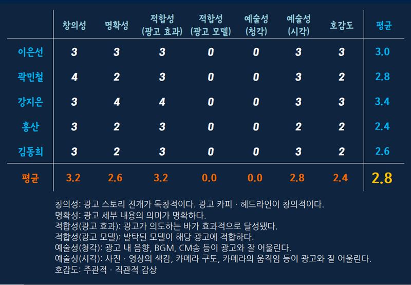 AP광고평론가들은 이 광고의 광고 효과가 뚜렷하지 않다며 명확성에 2.5점의 낮은 점수를 줬습니다.