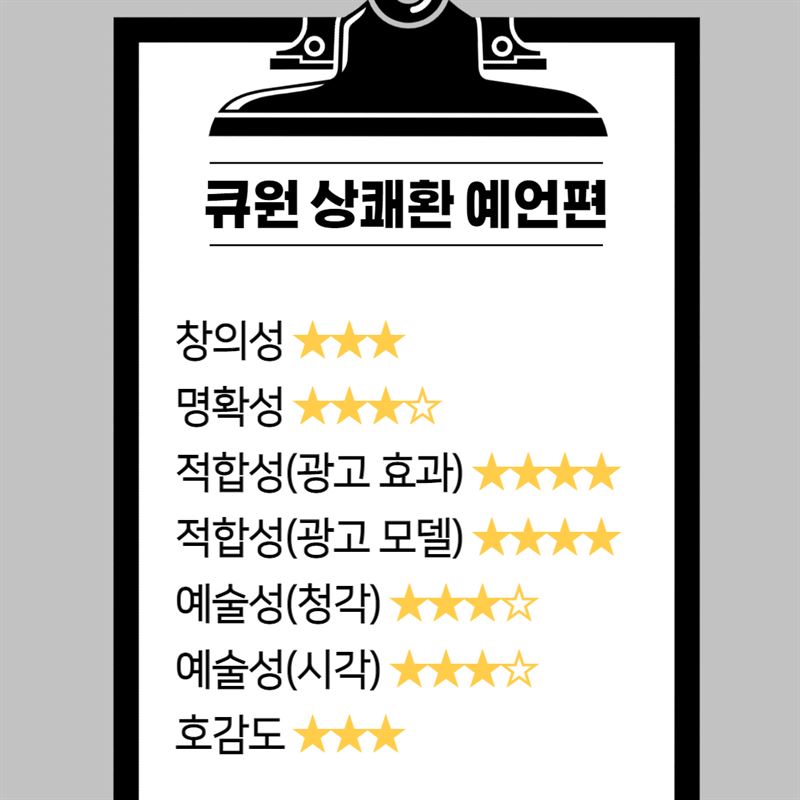 그 밖에 창의성, 예술성 시ㆍ청각 부문도 3.5점의(5점 만점) 무난한 점수를 받았으며 호감도는 3점을 받았습니다.