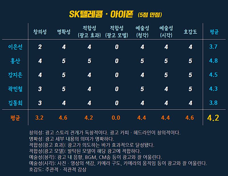 그 외 광고 효과의 명확성과 호감도도 4.5, 광고 효과의 적합성도 4점의 높은 점수를 받았습니다. (5점 만점)
