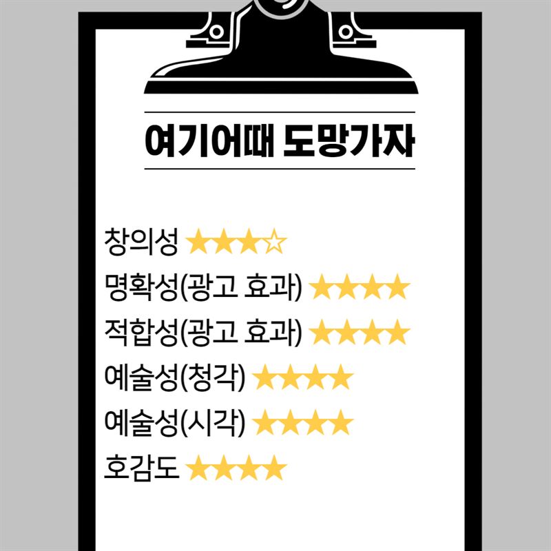 이은찬 평론가는 '도망가자' 카피와 함께 본격적으로 여행 장면으로 넘어가는 구성에 대해 언급하며 광고가 의도하는 바를 효과적으로 달성하는 요소라고 호평했습니다. 전체적인 카피가 내용 전개와 조화를 이루면서 효과를 극대화하는 측면도 언급했습니다.