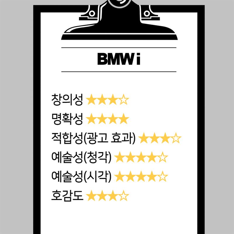 BMW의 순수전기 모델인 iX 및 i4의 이번 광고는, 배경음악으로 콜드플레이와 협업한 'Higher Power'를 삽입해 '새로운 세상을 위한 가장 강력한 움직임'을 훌륭하게 표현했다. 이와 함께 'TOMORROW IS TOO LATE'ㆍ'MAKE EARTH COOL AGAIN' 등, 모델들의 의상에 표기한 문구들을 통해 전기차를 통한 세상의 변화를 효과적으로 표현했다. 전기차로의 전환이 필요한 이유에 대한 메시지를 던지고, 후반부에 BMW iX 및 i4를 지속적으로 노출시키는 구성도 좋았다.