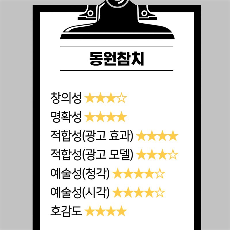 광고 효과의 적합성 또한 4점의 높은 점수를 받으며 제품을 확실히 각인시킨 광고라는 평을 받았습니다.