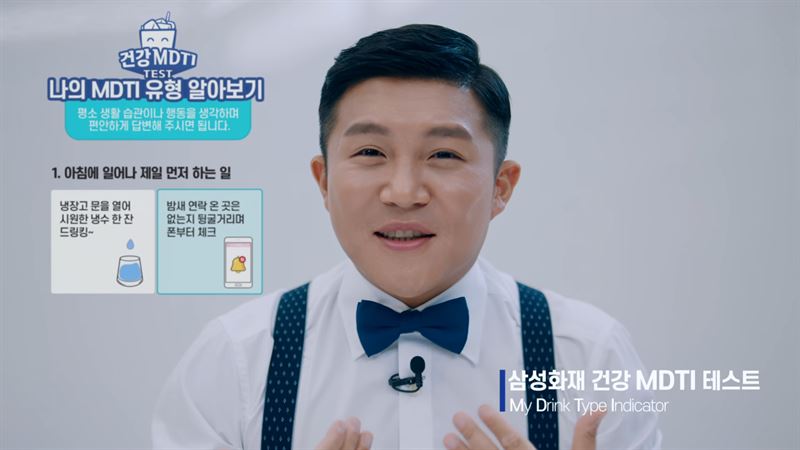 언뜻 들으면 편의점과 삼성화재 간의 연결성이 와닿지 않지만, 이어 광고는 삼성화재의 '건강 MDTI 테스트'를 소개하며 테스트를 하면 개인에게 맞는 음료를 추천해준다고 설명합니다.