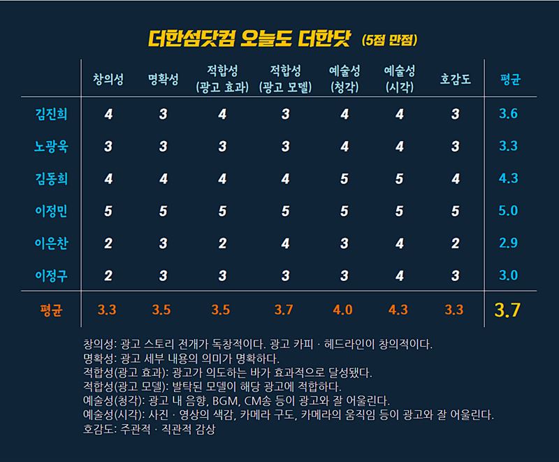 그 외 창의성, 명확성, 광고 효과의 적합성과 호감도는 3.3~3.5점 사이의 무난한 점수를 받았습니다.