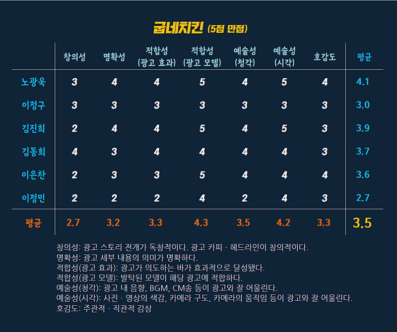 그 외 명확성과 광고 효과의 적합성, 호감도는 3.2~3.3을 기록했고 창의성은 2.7점의 비교적 낮은 점수를 받았습니다.