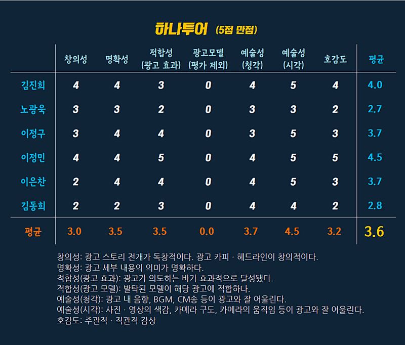 나머지 항목들은 모두 3.2~3.7점을 받아 전반적으로 호평을 받은 광고라고 볼 수 있습니다.