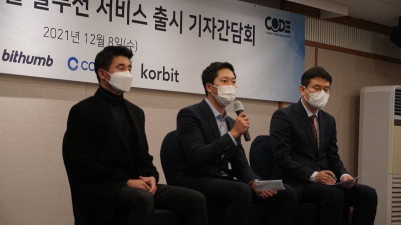 CODE는 8일 서울 중구 한국프레스센터에서 기자간담회를 열고 자체 솔루션의 연동 현황과 비전 등을 발표했다. 간담회에는 차명훈 CODE 초대 대표를 비롯해 방준호 빗썸 부사장, 진창환 코빗 준법감시실장 등 주요인사가 참석했다.