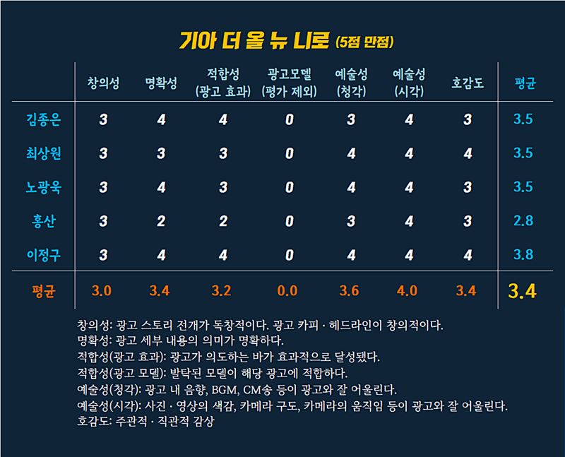 명확성과 호감도는 3.4점의 평이한 점수를 기록했고, 광고 효과의 적합성은 3.2점, 창의성은 3점으로 다소 무난한 편입니다.