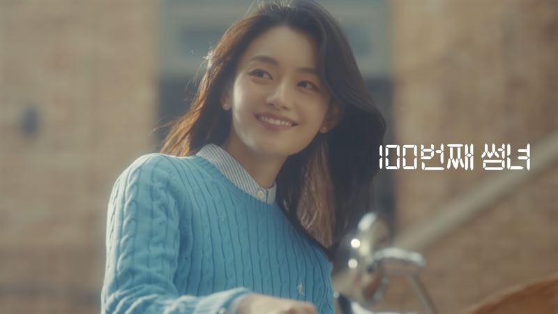 파란 빈폴 니트를 입은 여성이 자전거를 타고 등장하며, '100번째 썸녀'라는 자막이 나옵니다.