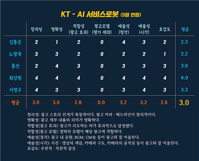 창의성과 명확성은 3점의 무난한 점수를 받았으며 광고 효과의 적합성과 호감도는 각각 2.8, 2.6점으로 다소 낮은 편입니다.