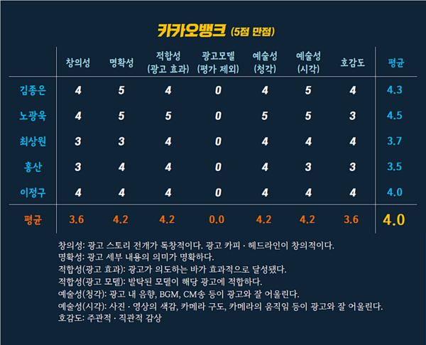 AP광고평론가들은 광고의 모든 항목에 3.6점 이상의 높은 점수를 부여해, 전반적으로 호평을 받은 광고라고 볼 수 있습니다.