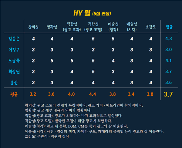 광고 효과의 적합성 또한 4점의 높은 점수를 유지했고, 긴장감을 고조시키는 배경음악으로 예술성 청각 부문과 호감도도 3.8점을 기록했습니다.
