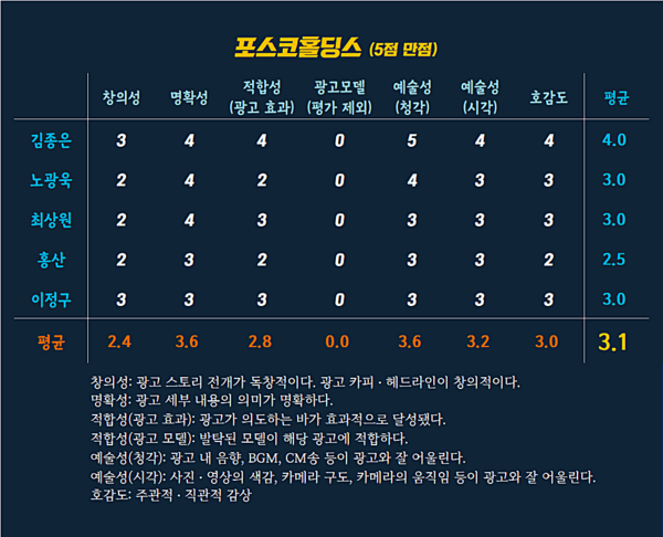 반면 창의성은 2.4점에 그치며, 광고가 어디서 많이 본 듯한 구성과 연출을 따르고 있어 지나치게 평범했다는 지적이 있었습니다.