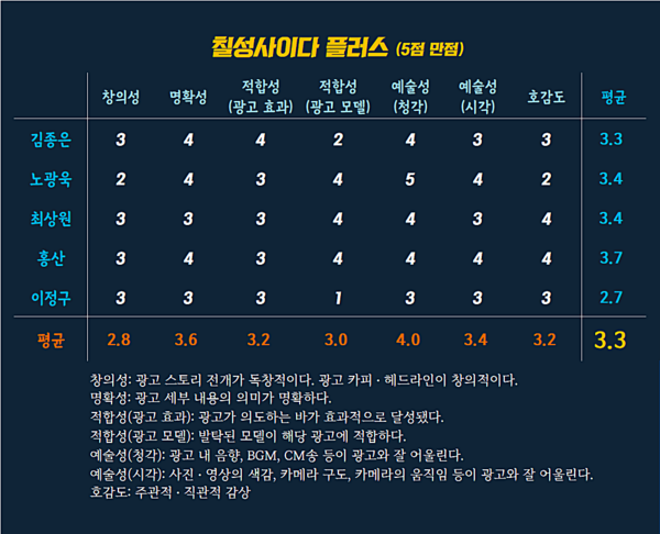 하지만 싸이라는 유명 연예인을 모델로 기용했음에도 광고 모델의 적합성은 3점을 기록했고, 창의성도 2.8점의 낮은 점수를 기록했습니다.