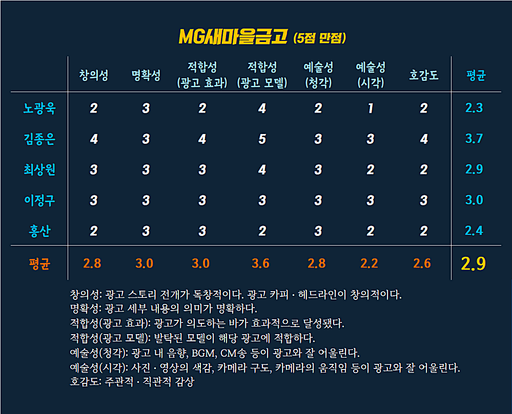 명확성과 광고 효과의 적합성은 3점을 받으며 전달하고자 하는 바를 무난하게 잘 드러낸 광고라는 평을 받았습니다.