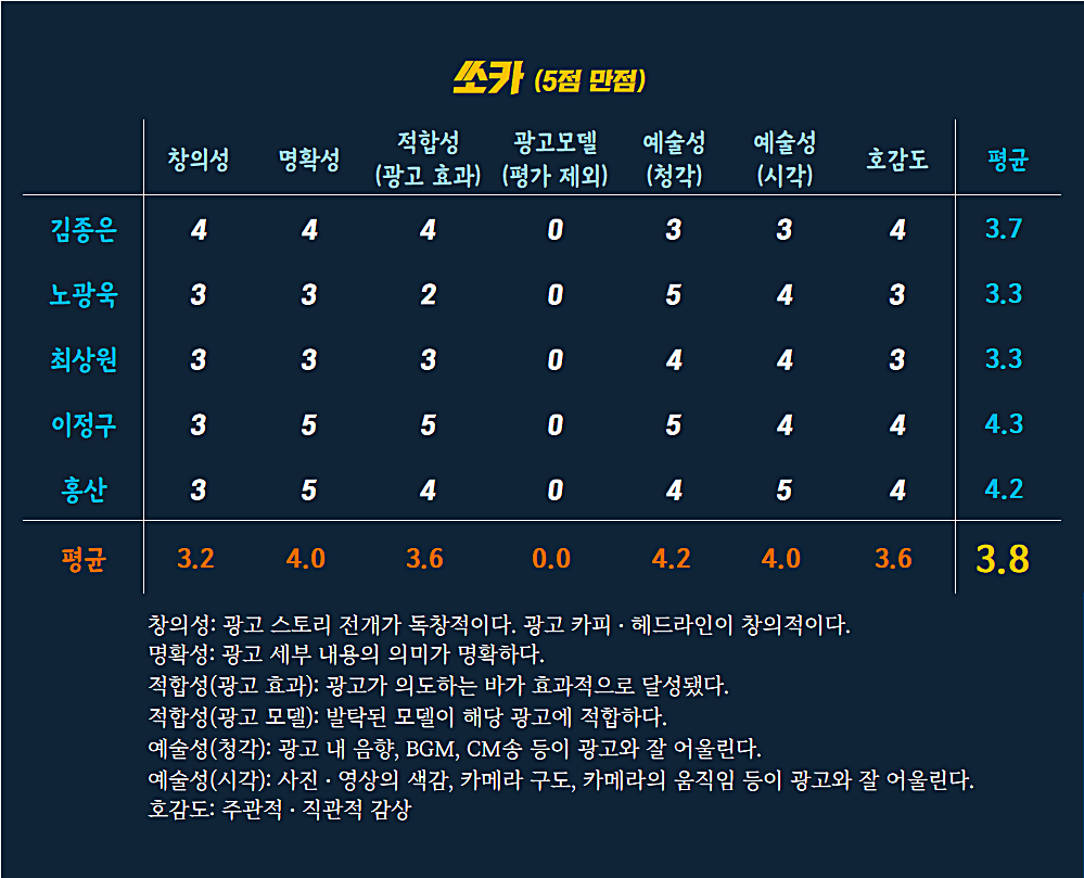 광고 효과의 적합성에는 3.6점, 창의성은 3.2점의 평이한 점수를 부여했습니다.