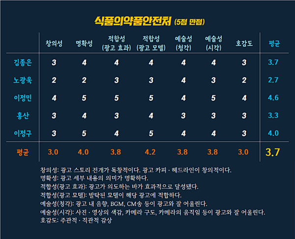 주요 키워드를 반복해 메시지를 명확히 전달해 명확성과 광고 효과의 적합성 또한 각각 4점, 3.8점으로 높다.