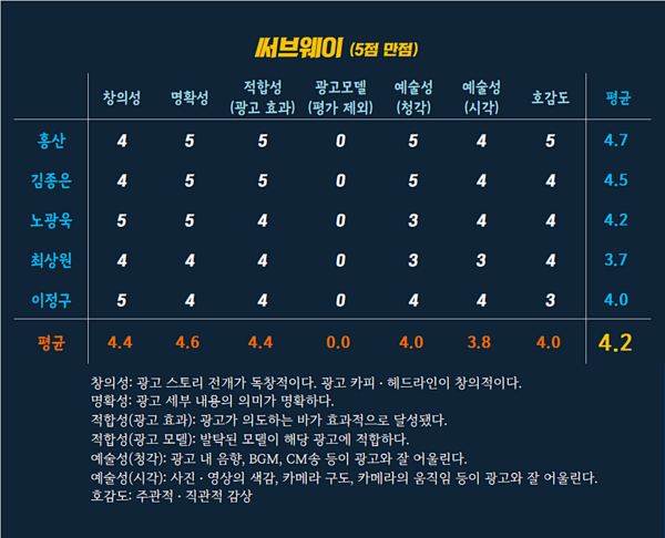 그 외 명확성과 광고 효과의 적합성도 4.2점은 점수를 기록하며 메시지를 확실히 전달하는 광고라는 평을 들었다.
