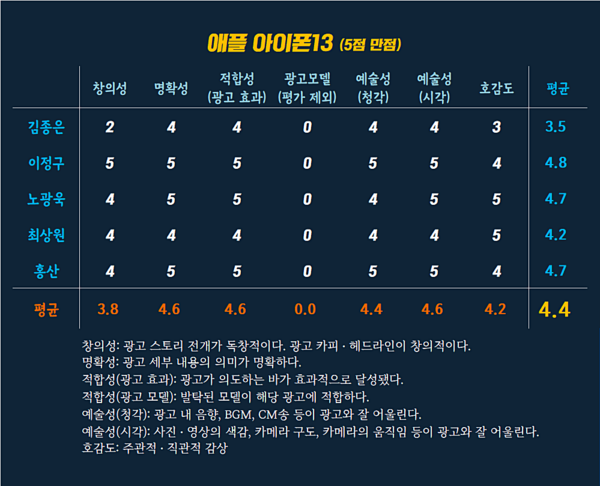 평론가들은 광고의 모든 평가항목에 3.6점 이상의 높은 점수를 부여해, 전반적으로 호평을 받은 광고라고 볼 수 있다.
