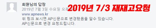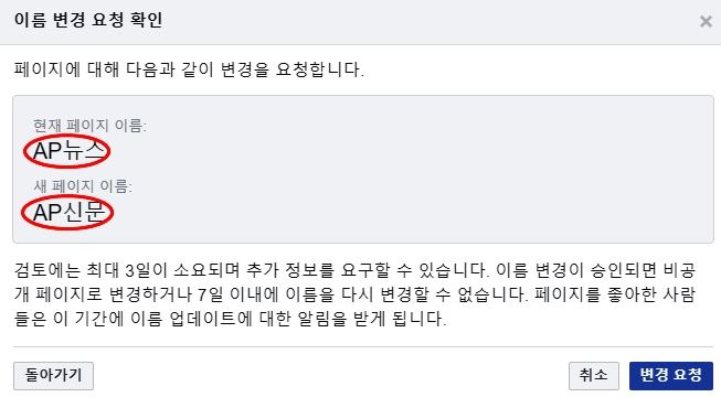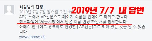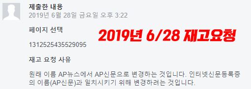 싸움(?)의 시작은 지난 6 월이다. AP뉴스의 제호가 작년 11월 경에 AP신문으로 변경됐다. 나혼자 그냥 바꾼게 아니라 절차를 거쳐 서울시청에 신청하여 변경됐다는 통지를 받았다. 이후 차일피일 미루다가 지난 6월 13일 페이스북에 페이지 이름 변경 신청을 했다.