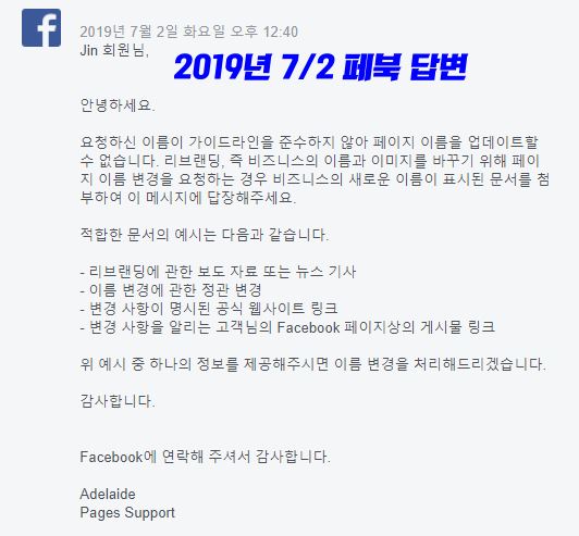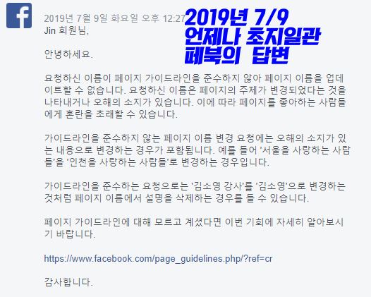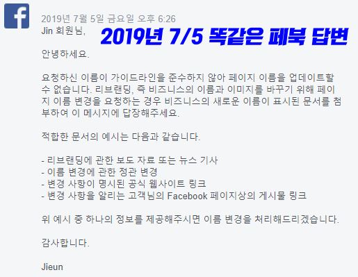 어쨌든 3~4번 전패를 한 후 생업에 바빠서 페이스북 이름 변경 신청을 손 놓고 있었다. 그러다가 오늘 다시 신청을 했다. 페북 답변 로봇은 그렇게 시간이 지났건만 멘탈이 강하다. 토씨 하나 틀리지 않는 답변을 또 내게 안겨줬다. 또 패배다.