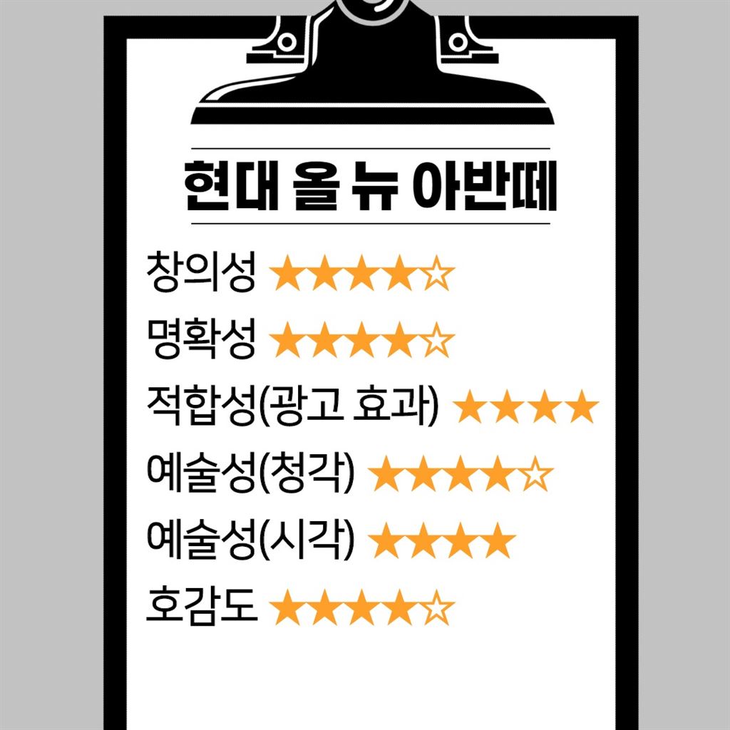 광고평론위원은 이 광고에 칭찬을 아끼지 않았습니다. 명확성 4.5점에 호감도도 4.5점입니다. 나머지 부문의 별점들도 이에 못지않게 높습니다.