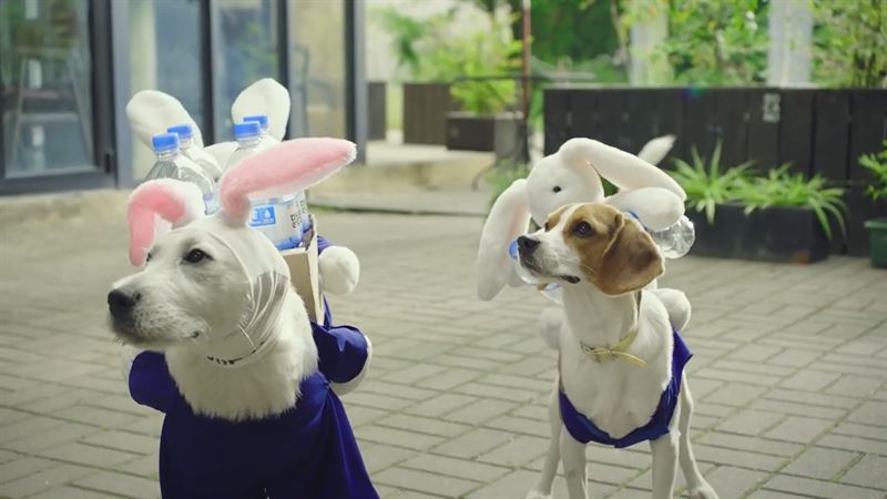 광고에는 토끼 분장을 한 강아지가 등장합니다. 깊은 산 속 맑은 샘에서 출발한 강아지의 등에는 맑은샘 수를 안고 있는 토끼 인형이 있습니다.